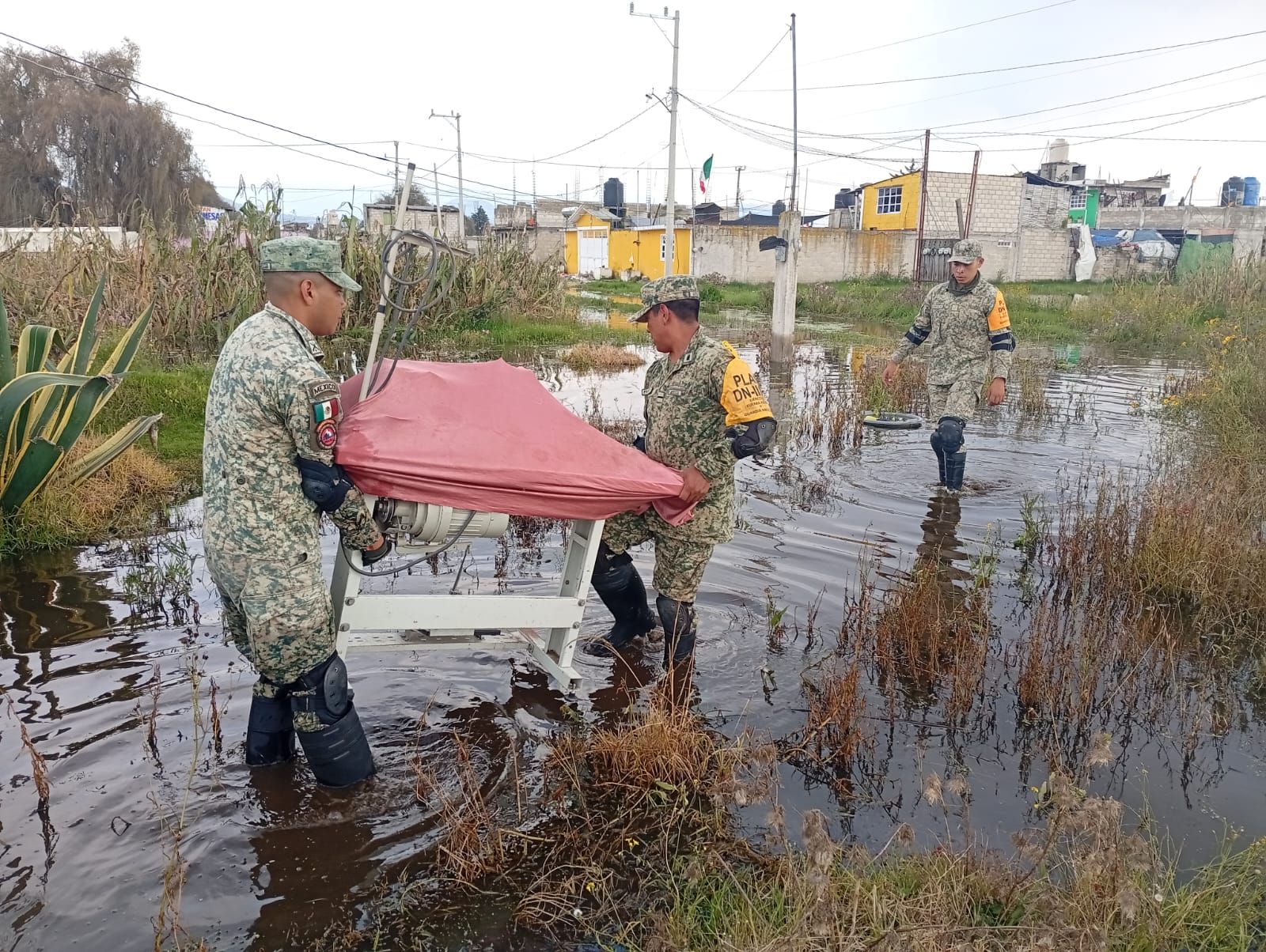 Tianguistenco.- El Ejército Mexicano aplicó el Plan DN-III-E en su fase de recuperación en Santiago Tianguistenco, tras las afectaciones provocadas por las lluvias registradas en los últimos días. El personal del 25 Batallón de Infantería y del Hospital Militar de Zona de Santa María Rayón brindó auxilio a la población en coordinación con autoridades locales.