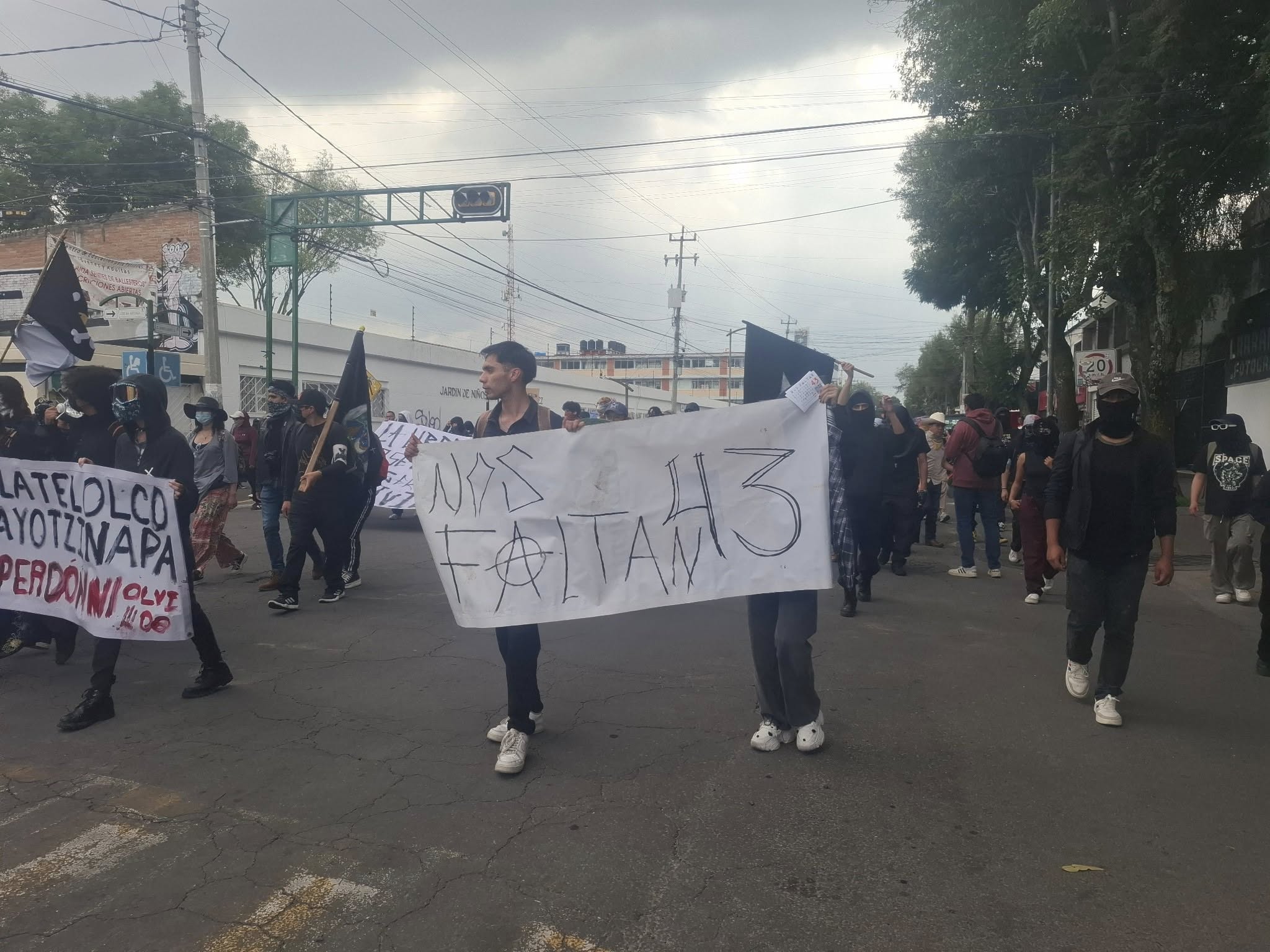 Durante el recorrido, se escucharon consignas como “Ayotzinapa vive, la lucha sigue”. Los manifestantes se detuvieron frente a establecimientos comerciales en las calles Juárez e Hidalgo para expresar solidaridad con causas internacionales como la situación en Palestina.