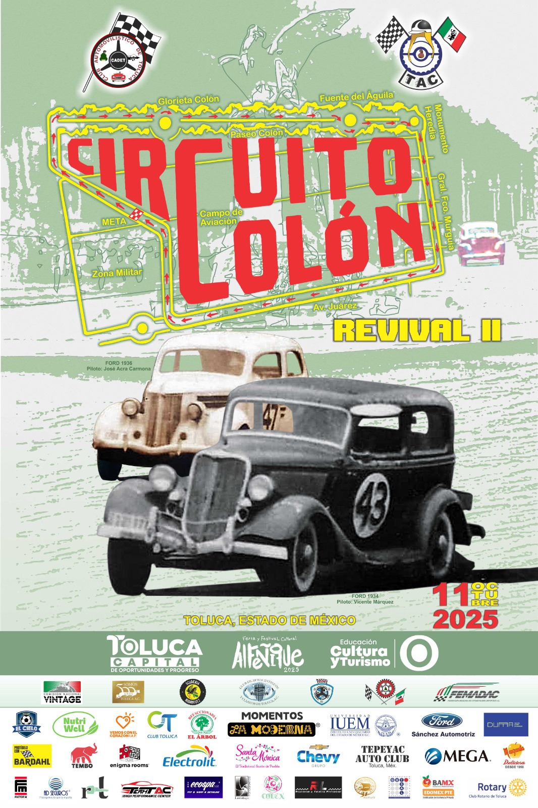 Toluca.- Este sábado 11 de octubre, las calles de Toluca volverán a ser testigo del histórico Circuito Colón. A partir de las 8:00 horas, se llevará a cabo un recorrido con 63 autos clásicos que partirán desde el Monumento del Centenario de la Independencia, conocido como El Águila.