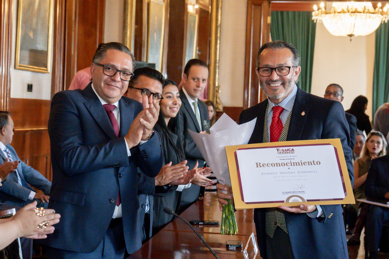 El alcalde entregó reconocimientos por su destacada trayectoria y aportaciones a Joaquín Alava Quintanilla, Jesús Henkel Libién, Carlos Alejandro Monroy Carrillo, Guillermo Ochoa García y al comediante Memo Ríos, quienes con su talento y compromiso enaltecen el nombre de Toluca.